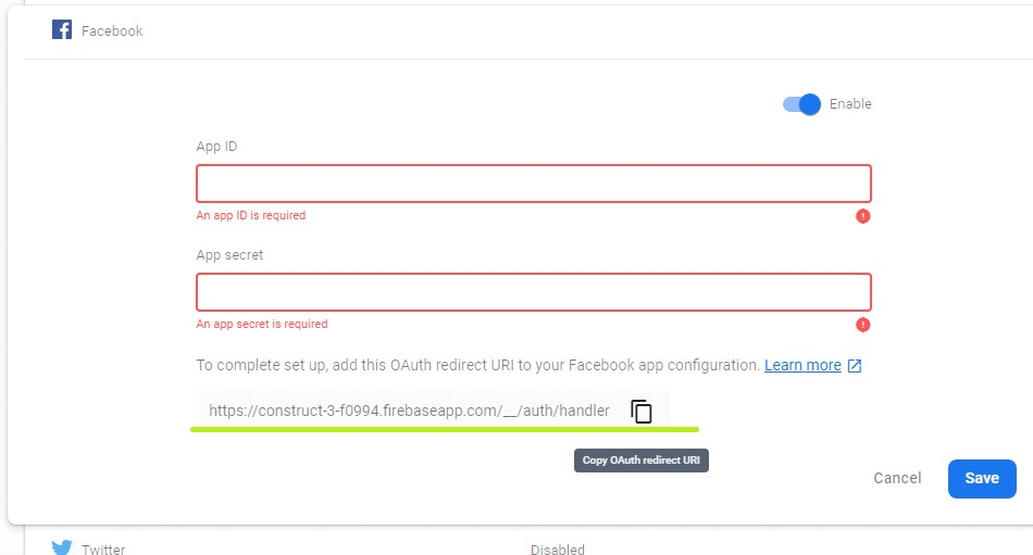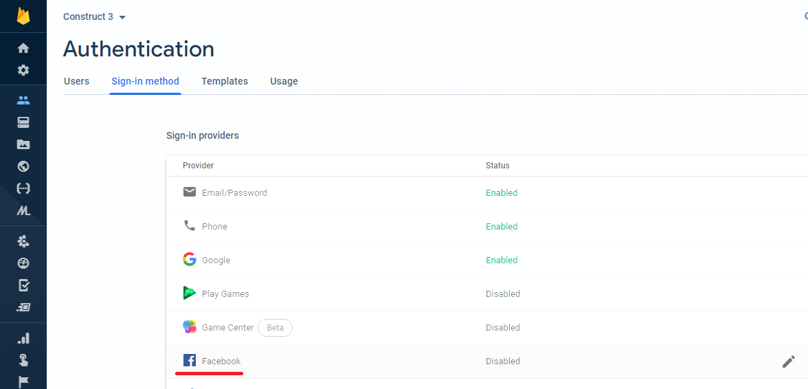 - Go to Authentication> Sign in method> Facebook, then Press on Edit button