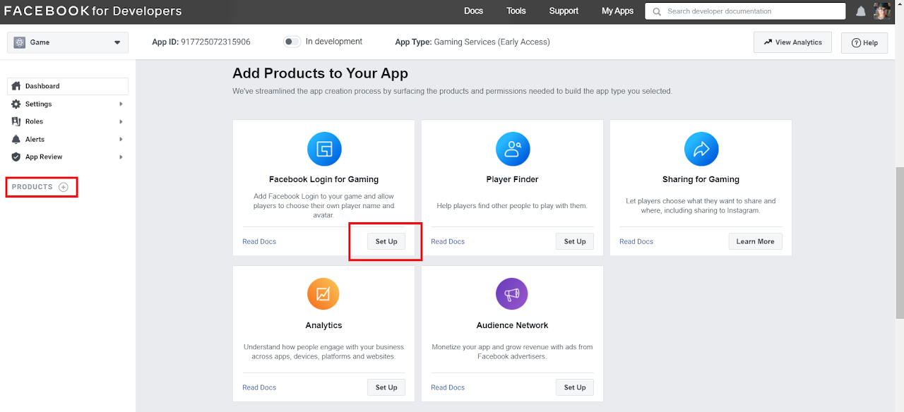 - Go to PRODUCTS> Facebook Login for Gaming
