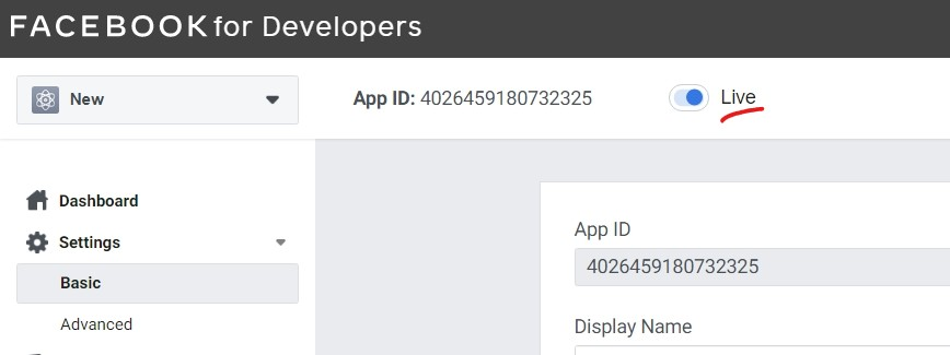 - Click on the "In development" Toggle Button to turn on "Live" Settings for your Facebook App.