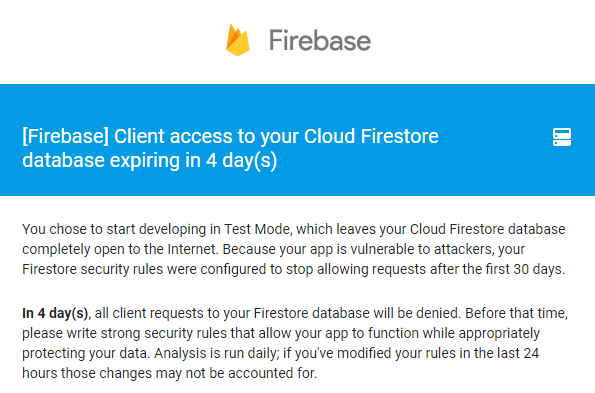 If you have ever received an email like this from Firebase, you are using the Default (Test Mode) Security Rules that only allow access to the database for the first 30 days.